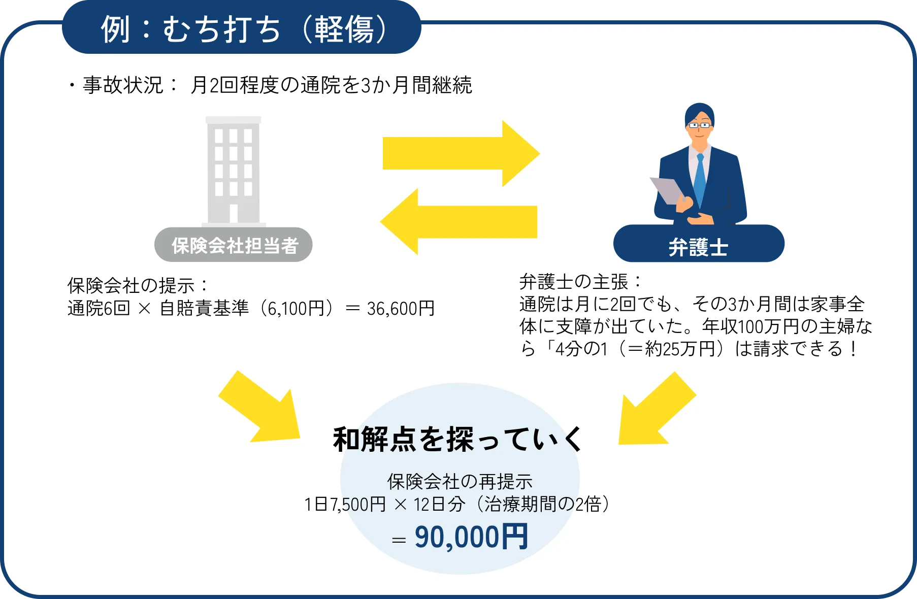 保険会社からは、実際の通院日数のみを基準に提案してくることも多いのですが、弁護士が介入することで、医学的資料や実際の生活状況を元に適切な補償額を算定し、交渉します。弁護士が「実際には3か月間、家事に大きな支障があった」と主張し、数十万円規模で補償を引き上げる交渉を行うことができます。