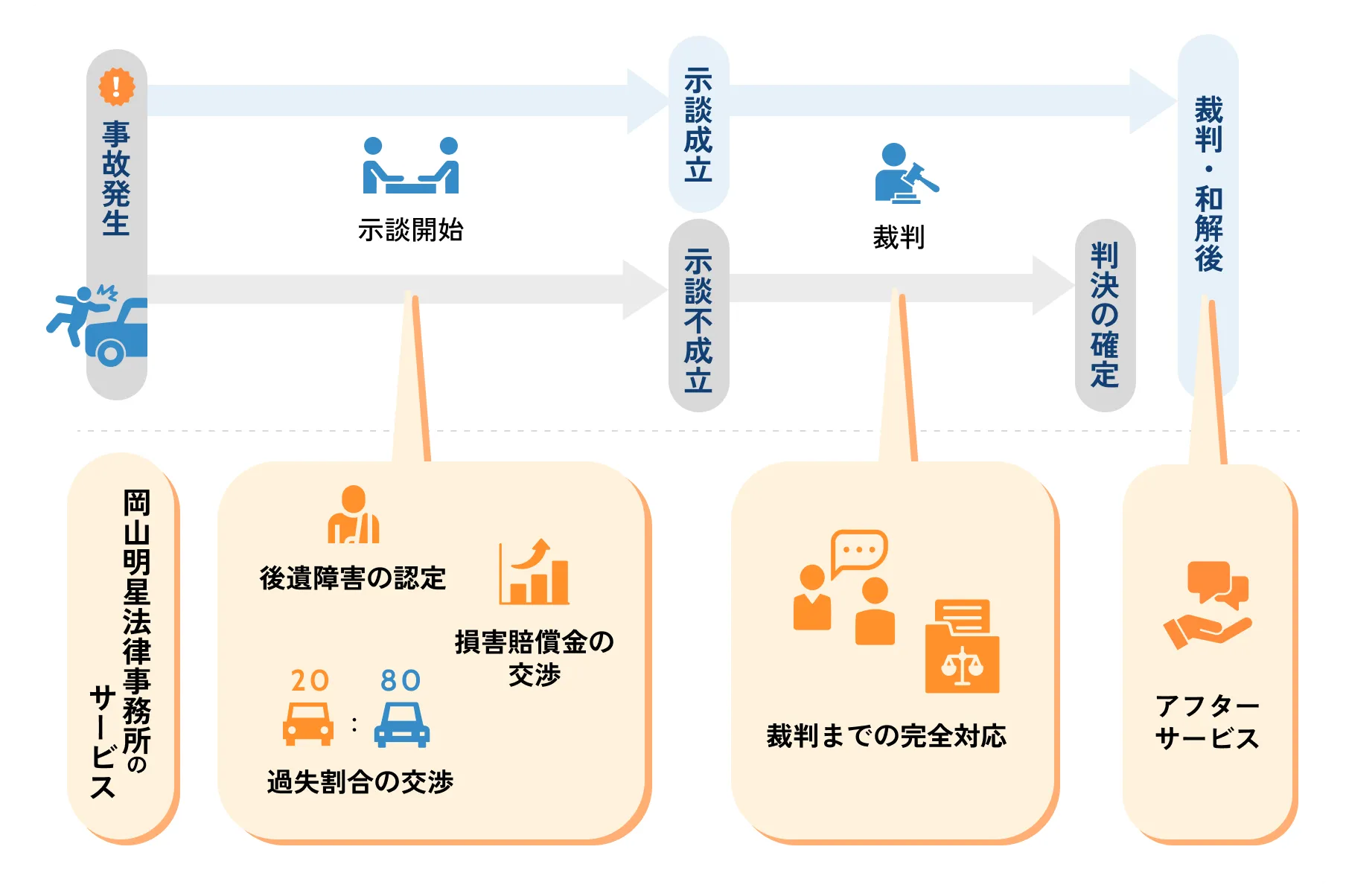 岡山明星法律事務所では、交通事故に関する多様な法的サポートを一貫して提供しています。